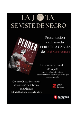 Presentación de la novela de José Sanrromán " Perder la cabeza". La novela ambientada en la Jota, en la que podremos descubrir calles, plazas, establecimientos y personajes reales del barrio. ¿Qué harías si al despertar una mañana en tu propia cama te encuentras con un cadáver a tu lado? Un exitoso abogado y un guardia civil con un turbio pasado, que continúa lidiando con antiguos demonios, se ven salpicados por unos extraños sucesos que conmocionan la ciudad de Zraagoza el verano de 2