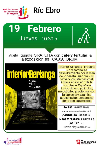 CaixaForum Zaragoza acoge una actividad muy especial diseñada para los socios de la Red de Centros de Convivencia: una visita guiada a la exposición 'Interior Berlanga' que culmina con un distendido café-tertulia. Esta muestra que ofrece un viaje íntimo por la vida y la filmografía de uno de nuestros directores más geniales, Luis García-Berlanga, a través de una escenografía cinematográfica que incluye más de 220 piezas originales. Es una oportunidad honesta para recordar títulos inolvidables como 'Bienvenido, Mr. Marshall' o 'El verdugo'.